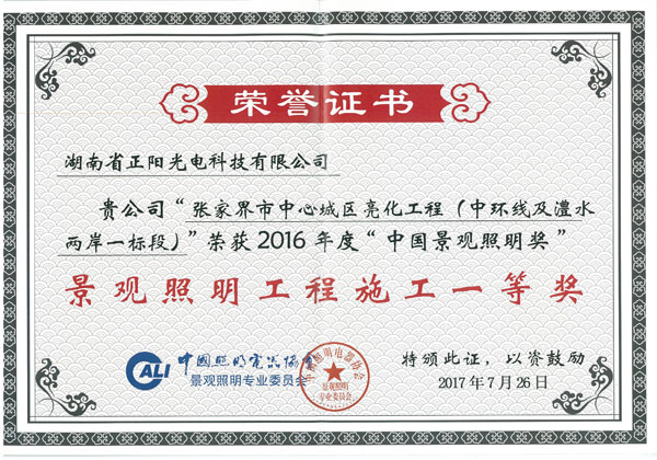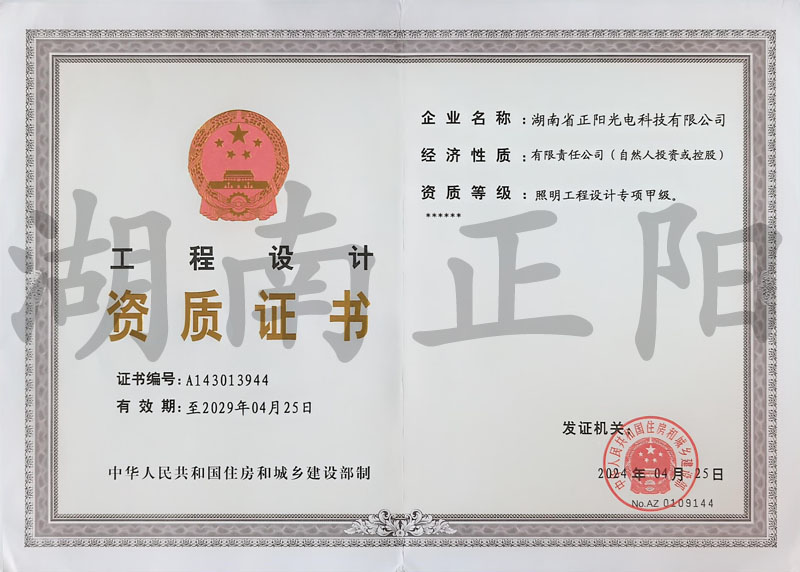 湖南省正陽光電科技有限公司是一家從事亮化工程及大型燈光藝術的設計、制作、安裝和維護于一體的專業化公司。公司資質齊全、管理嚴謹、技術先進、實力雄厚,取得了城市及道路照明工程專業承包壹級資質、照明工程設計專項甲級資質、機電工程施工總承包貳級資質、施工勞務等資質,榮獲“重質量·守誠信”示范企業。